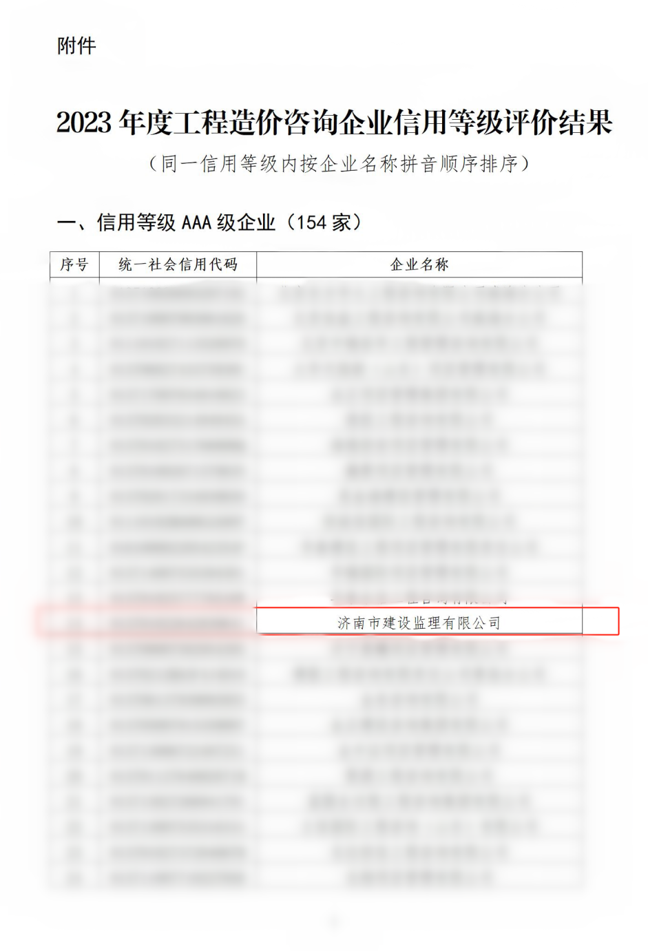 喜報(bào)!濟(jì)南監(jiān)理獲評(píng)2023年度山東省工程造價(jià)咨詢企業(yè)信用等級(jí)評(píng)價(jià)AAA等級(jí)
